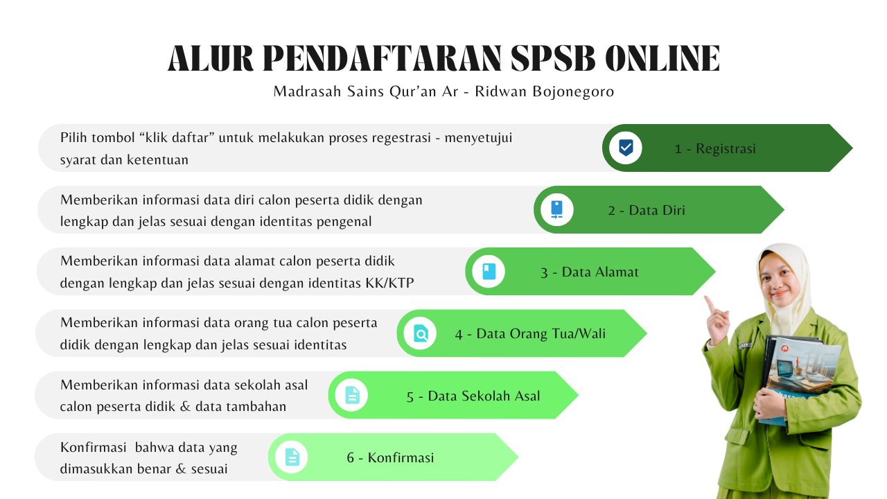 MTs SAINS QUR'AN AR - RIDWAN menyediakan SPSB secara online diharapkan proses SPSB dapat berjalan cepat dan bisa dilakukan dimanapun dan kapanpun selama sesi SPSB Online dibuka. Proses pendaftaran calon siswa baru yang terhambat oleh jarak jika datang ke madrasah langsung, bisa mengakses website SPSB Online MTs SAINS QUR'AN AR - RIDWAN.